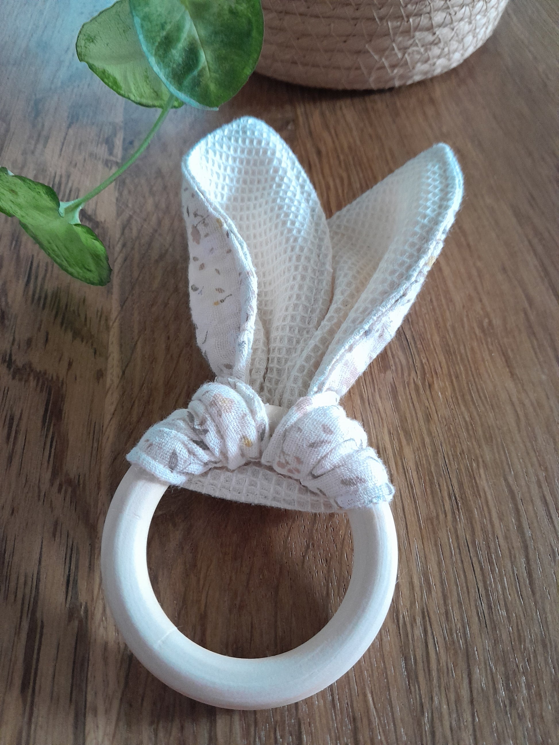 Cet anneau de dentition en gaze de coton apaise les gencives sensibles de bébé. Son motif de petites fleurs ajoute une touche douce et élégante. Fabriqué avec un anneau en bois non traité, il renforce les muscles de la mâchoire tout en assurant la sécurité de bébé.