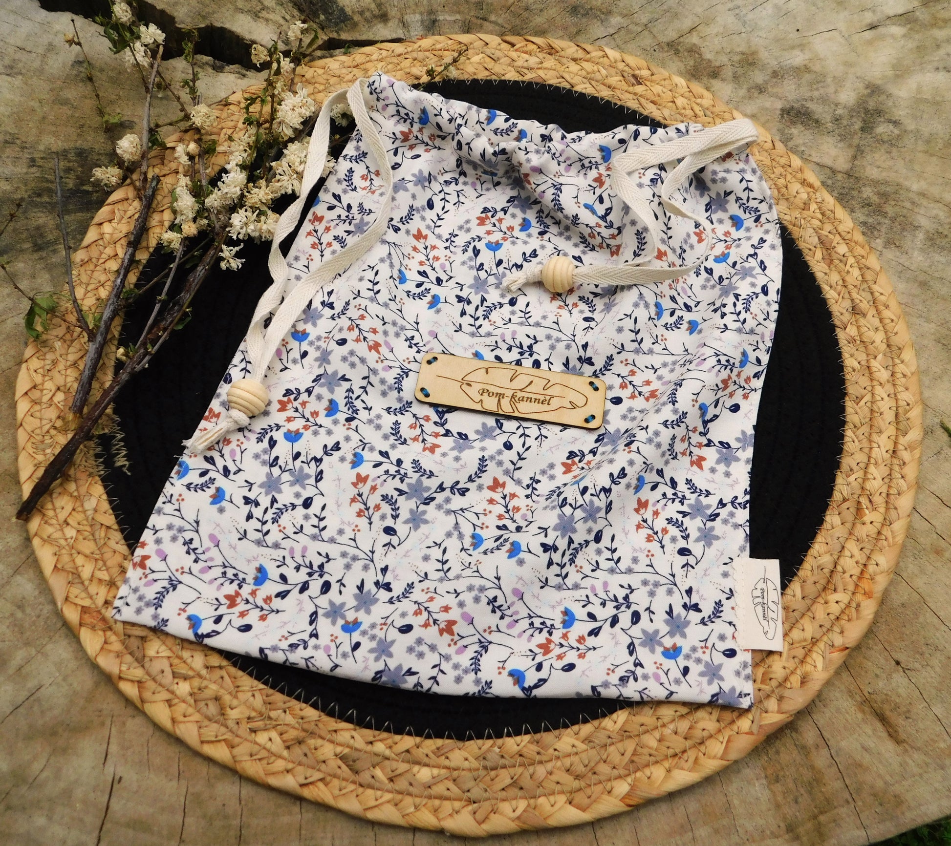 Ce sac à cordon en viscose avec petites fleurs bleues est conçu spécialement pour les besoins de votre bébé. Avec ses dimensions de 27 cm x 24 cm, il est parfait pour ranger ses affaires lors d'une petite balade. Il est doux et léger, idéal pour garder les objets de bébé en sécurité et en ordre.