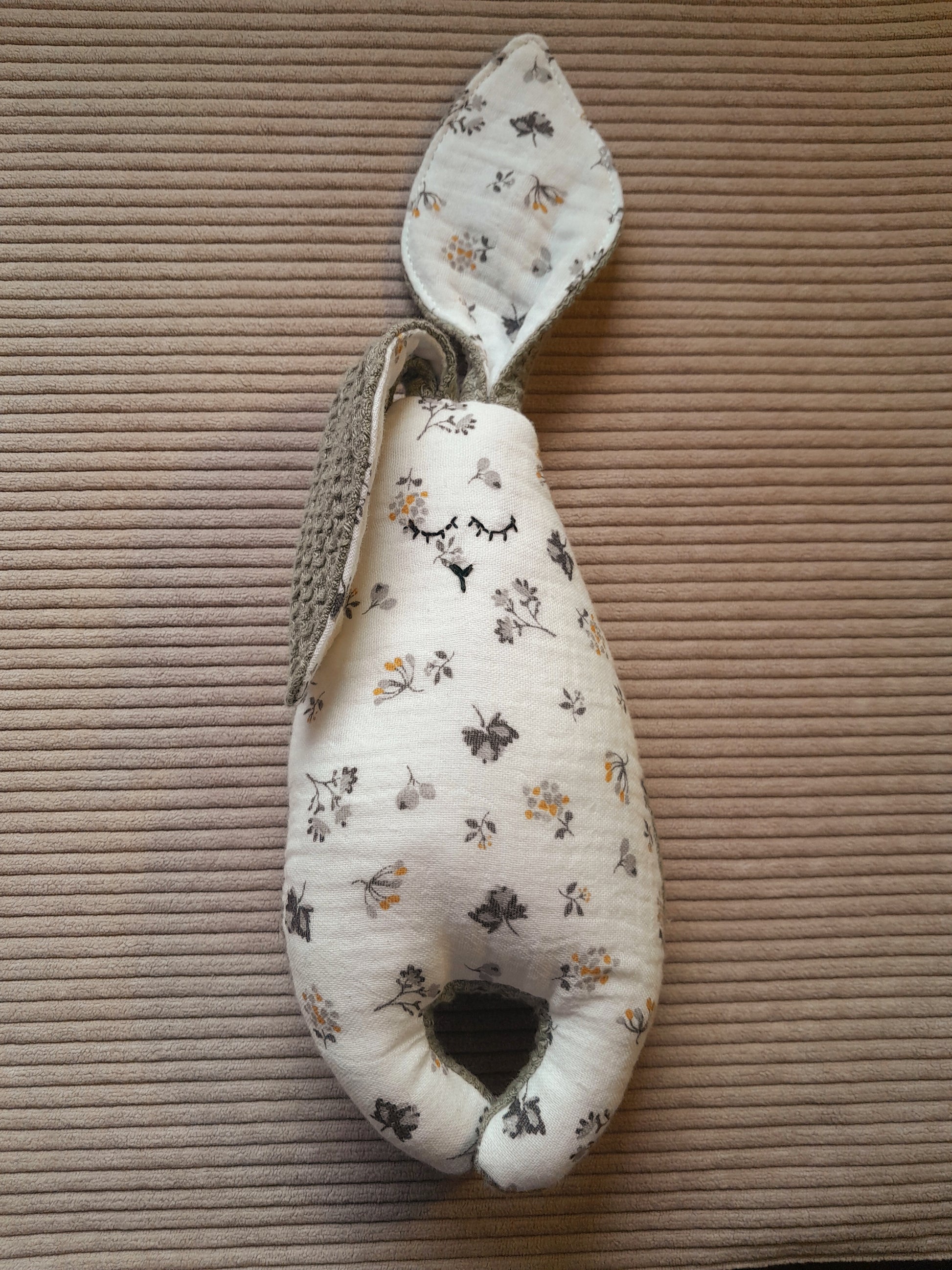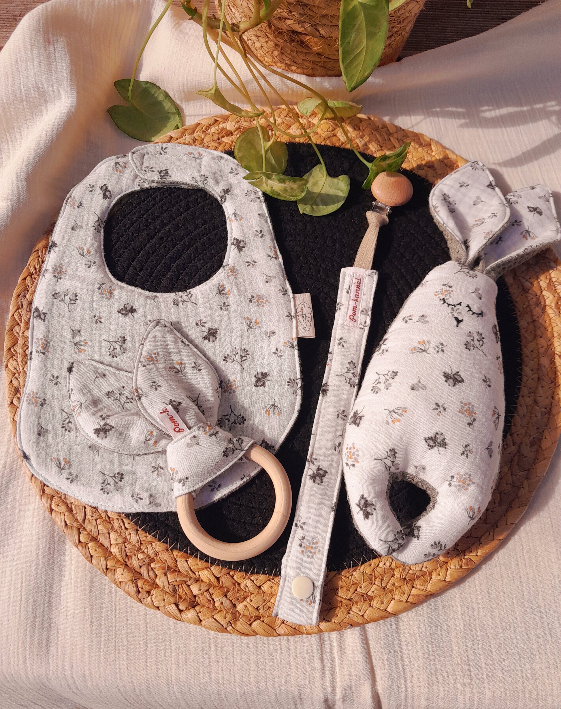 Découvrez notre coffret naissance en gaze de coton fleuri et nid d'abeille kaki. Comprend un doudou lapin, un attache-tétine, un bavoir et un anneau de dentition. Idéal pour offrir un cadeau pratique et élégant aux nouveaux parents.